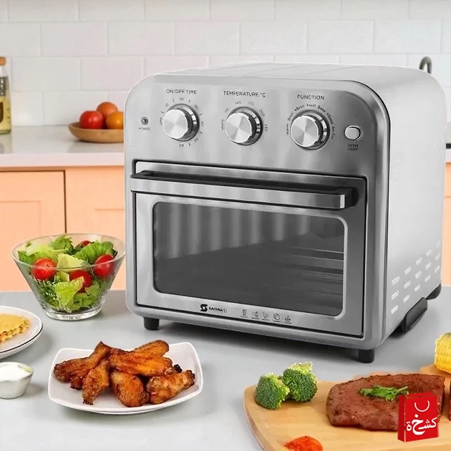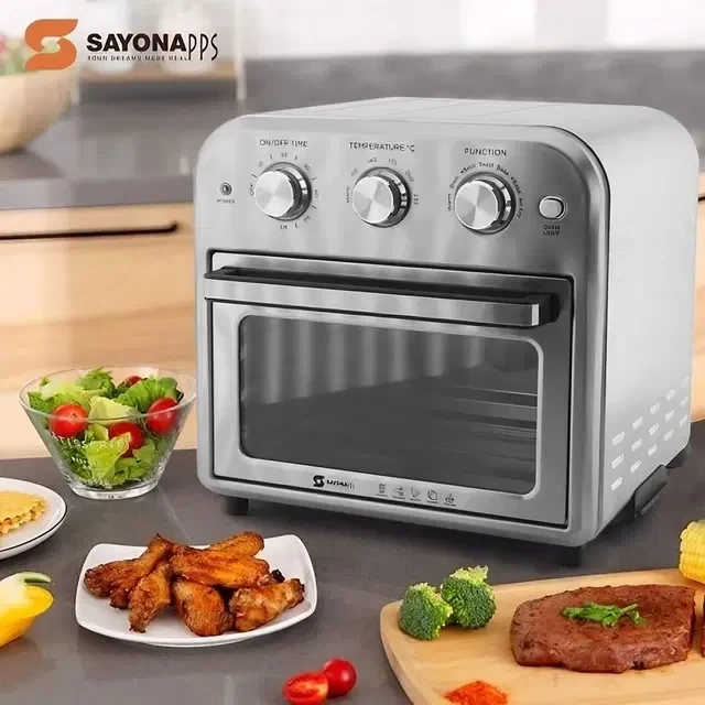 قم بالخبز والقلي والشوي بسهولة مع فرن ومقلاة هوائية Sayona SAF-4351 2 في 1. بسعة 10 لتر وطاقة 1500 واط، استمتع بالأطعمة المقرمشة والمخبوزة مع استخدام أقل للزيت، مثالي للمطابخ المنزلية والشقق الصغيرة والوجبات السريعة.