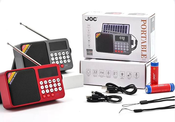 استمتع بالموسيقى في أي مكان مع جهاز JOC-6108 المحمول الذي يجمع بين راديو FM، مشغل MP3، سماعة بلوتوث، ودعم الشحن بالطاقة الشمسية. مثالي لـ الرحلات، التخييم، والطوارئ، حيث يوفر لك تجربة صوتية متكاملة في جهاز صغير وسهل الحمل.