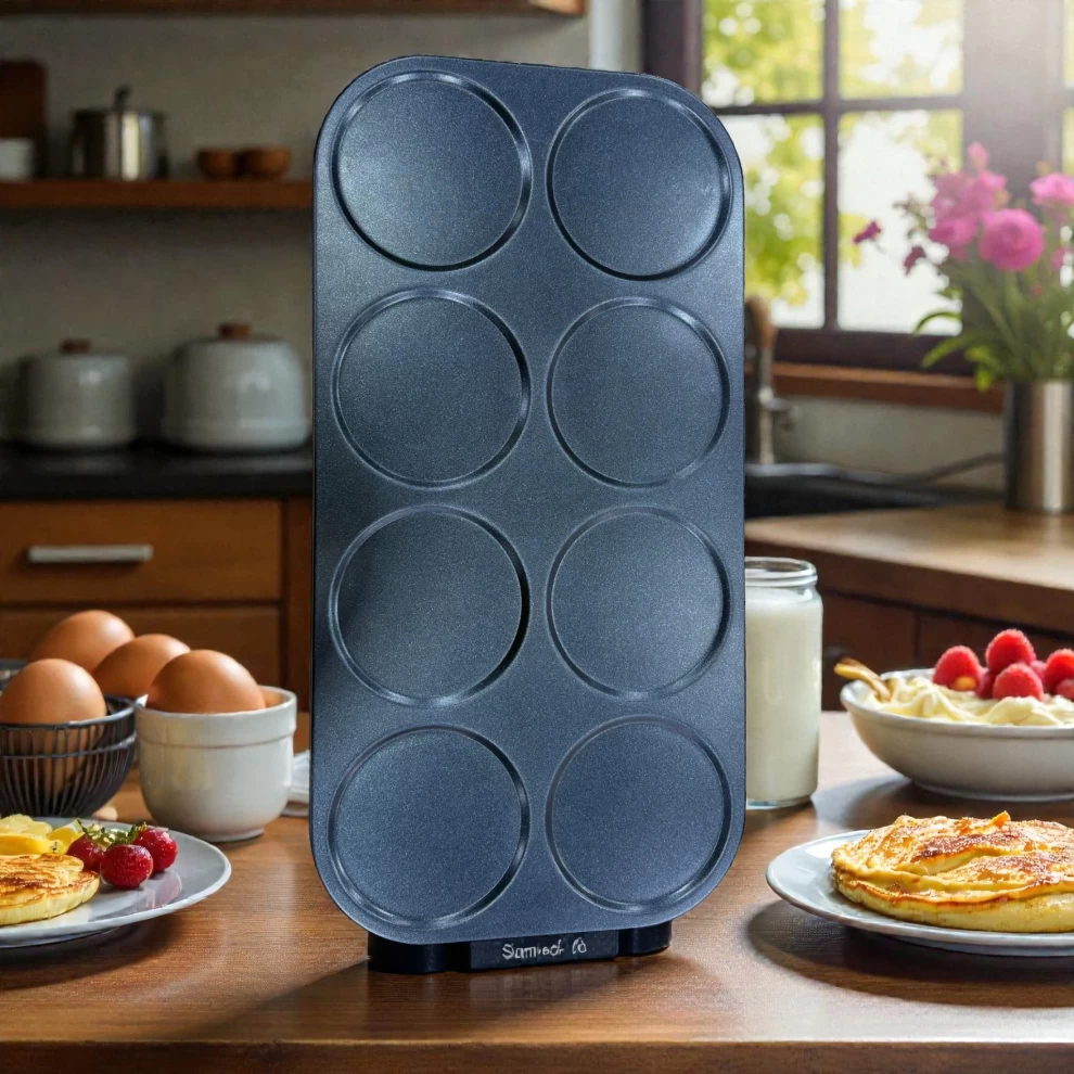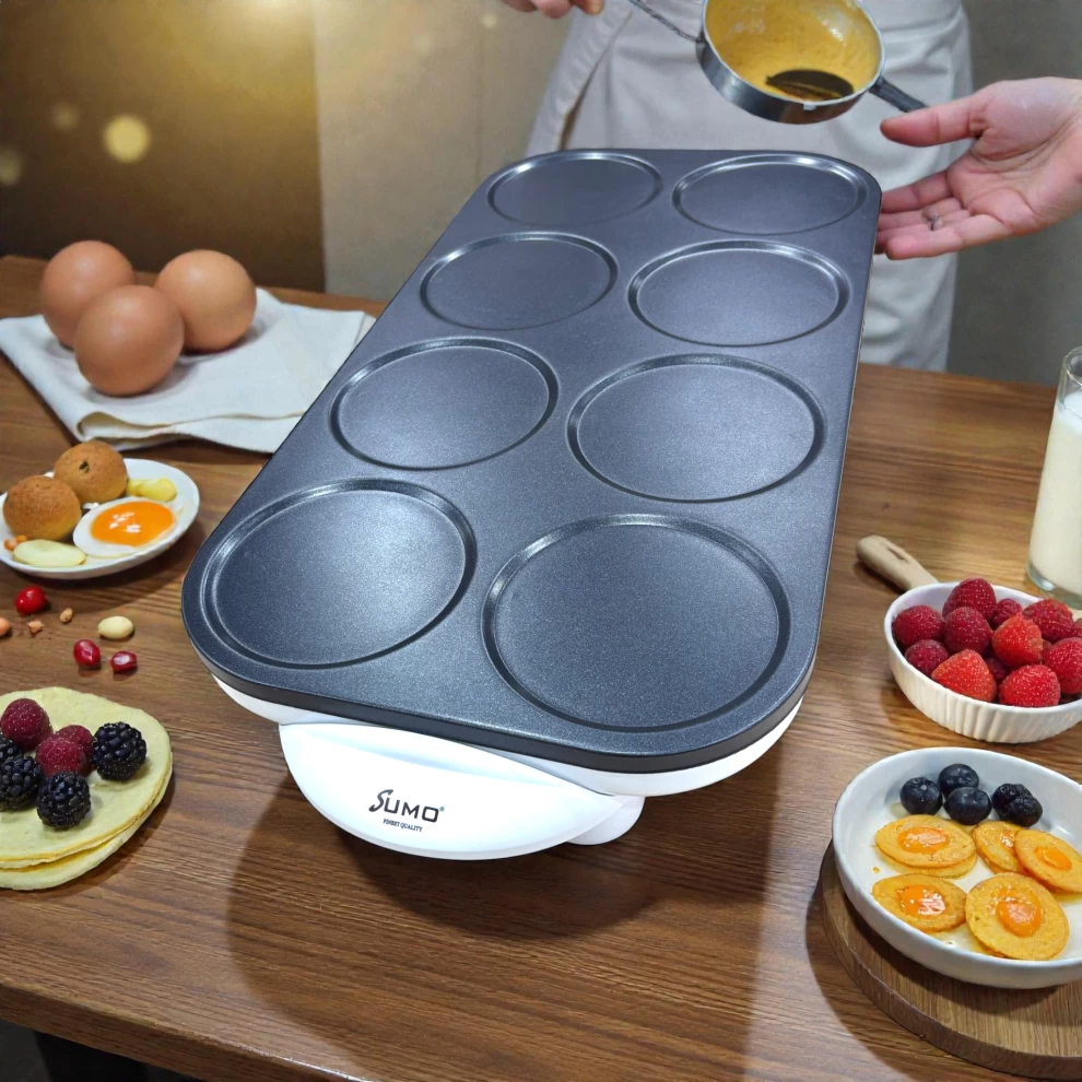 The Sumo Multifunctional Omelette and Pancake Maker is a powerful, time-saving kitchen appliance designed to prepare perfectly round pancakes, omelettes, eggs, blini, and batter-based breakfasts with ease. Featuring 8 non-stick cooking plates, a high-power 1350W heating system, and an automatic thermostat, it delivers fast, even cooking for families, busy mornings, and home chefs who want consistent results without mess.
