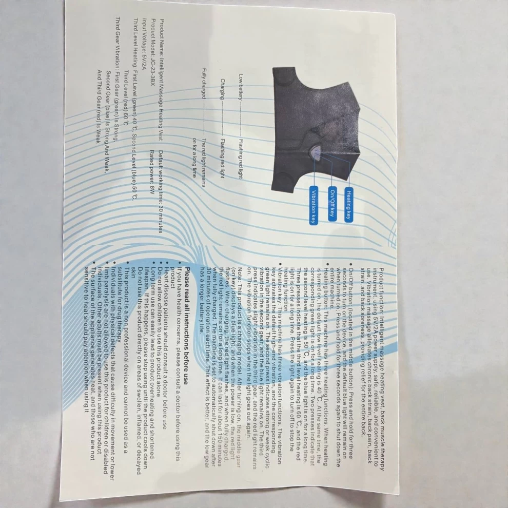 Relax and relieve muscle pain with this Intelligent Thermal Massage Vest, designed to provide effective heat and vibration therapy for back, shoulder, and muscle tension relief. Ideal for daily use at home or office, it helps improve blood circulation and reduce fatigue.