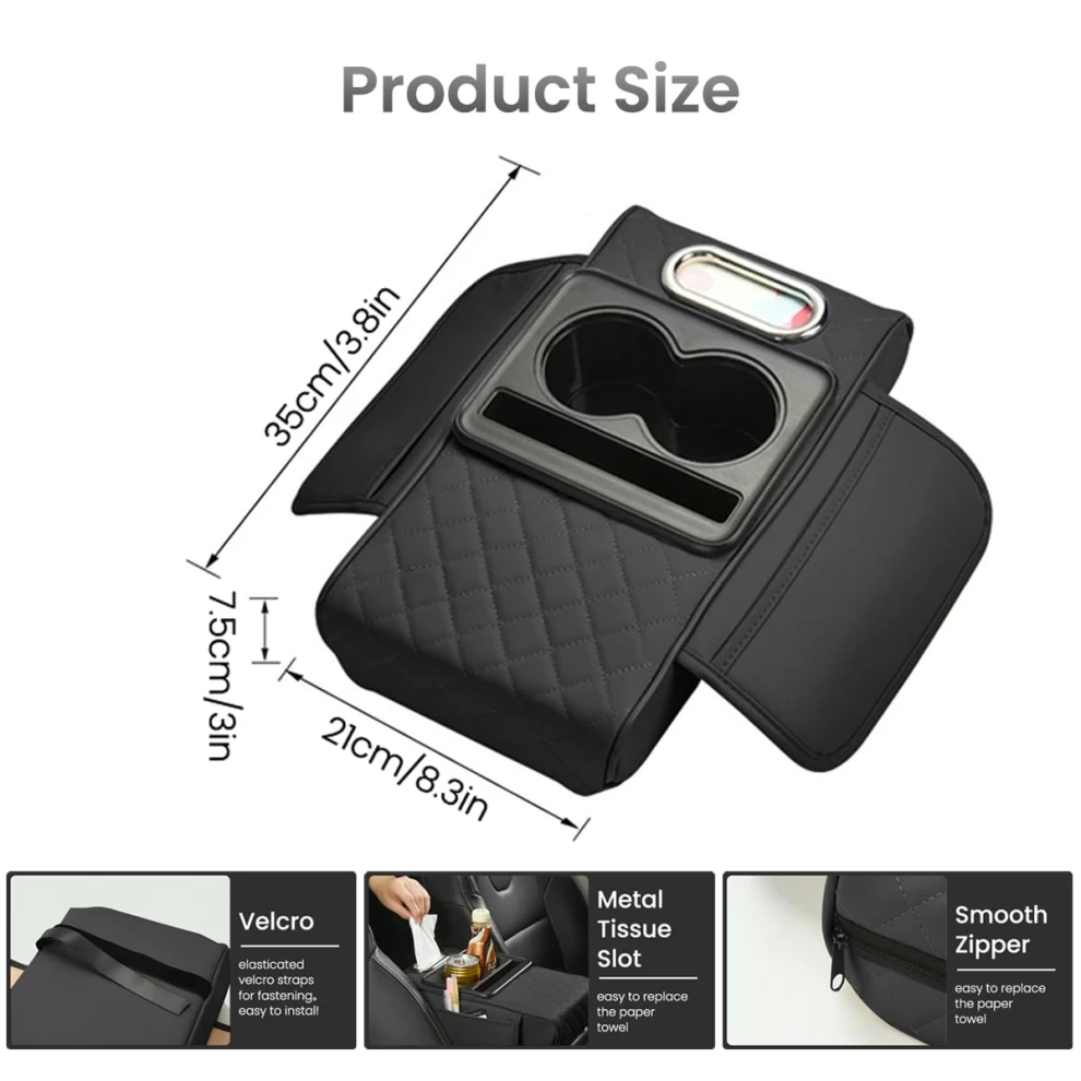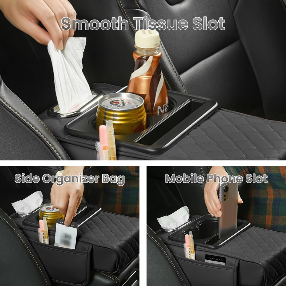 • Features: Cup holder, phone slot, tissue box, 2 storage pouches