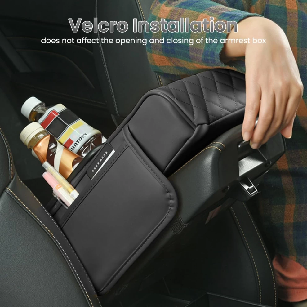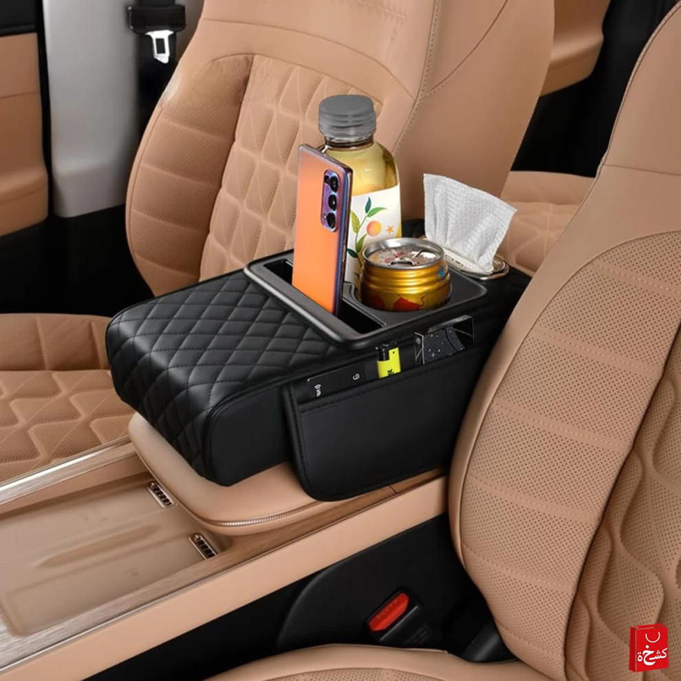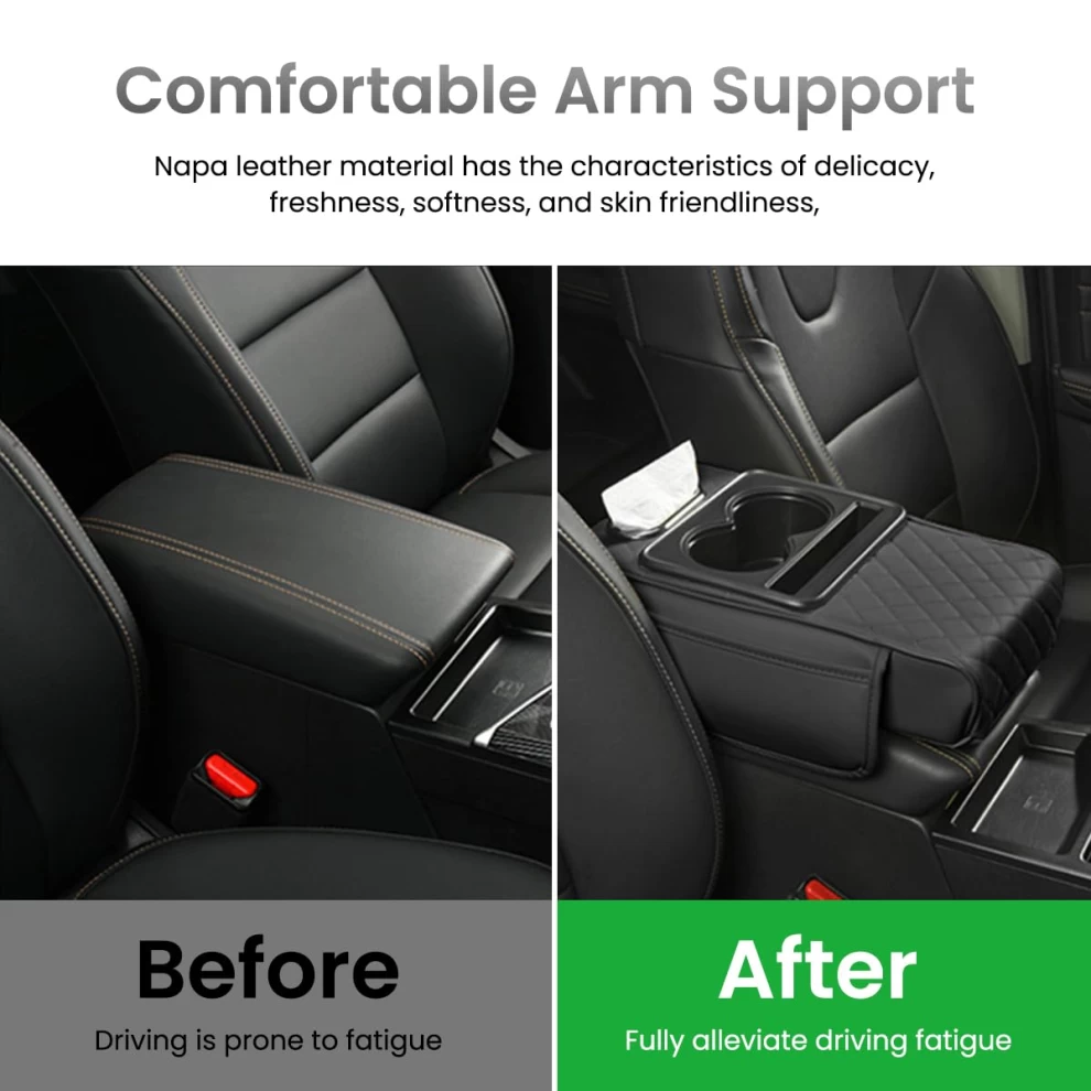 Upgrade your driving comfort with the Multifunctional PU Leather Car Armrest Cushion. Designed for long drives, it provides ergonomic support and convenient storage, keeping your essentials within reach. With a cup holder, phone slot, tissue box, and 2 storage pouches, this universal armrest is perfect for any car.