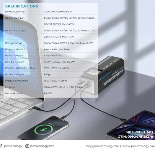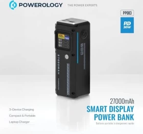 Meet the Powerology 27000mAh Smart Display Power Bank, the ultimate companion for staying charged on the go! With a massive 27000mAh capacity and 140W ultra-fast output, it keeps your devices powered anytime, anywhere. Perfect for tech enthusiasts, travelers, and busy professionals who rely on their devices all day. The smart display keeps you informed about battery levels, charging speeds, and port usage—making charging intuitive and stress-free.