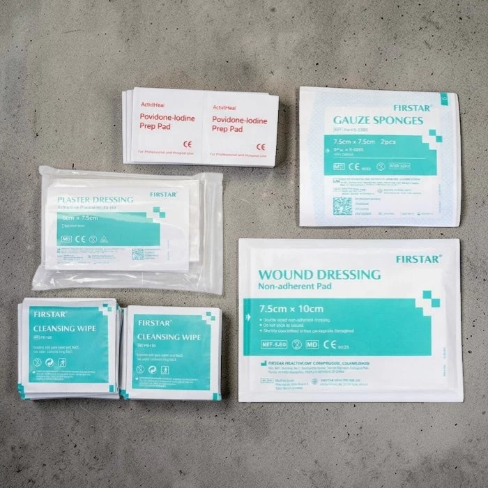 • 🧼 Sterile Cleaning Supplies – Includes wipes and iodine pads for proper wound sanitation.
