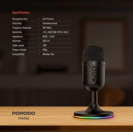 🎙️ Porodo Gaming Omni-Directional USB Microphone – Clear Voice for Streaming & Gaming