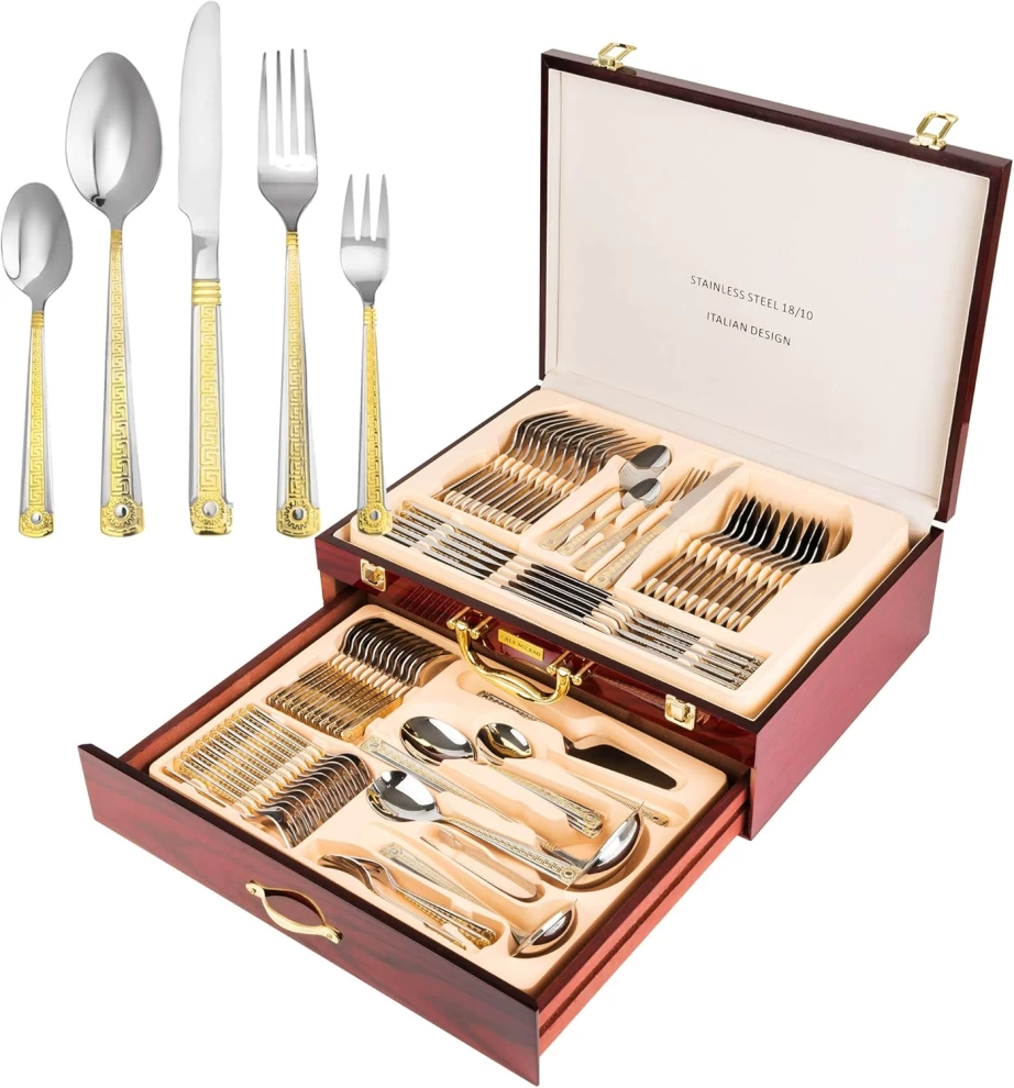 Elevate your dining experience with the Italian Collection “Antique Greek” 72-Piece Premium Silverware Flatware Serving Set. Designed with classic antique Greek-inspired patterns and a luxurious polished finish, this elegant set adds sophistication to any dining table.