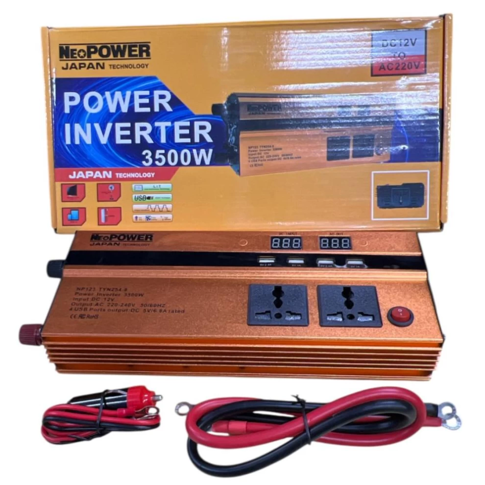Turn your car battery into a powerful energy source with the NeoPOWER Power Inverter (12V to 220V, 3500W). Designed for travel, camping, and emergency backup, this inverter allows you to run household appliances and charge devices directly from your vehicle. With high power output and multiple protections, it’s a reliable solution for on-the-go electricity anytime, anywhere.
